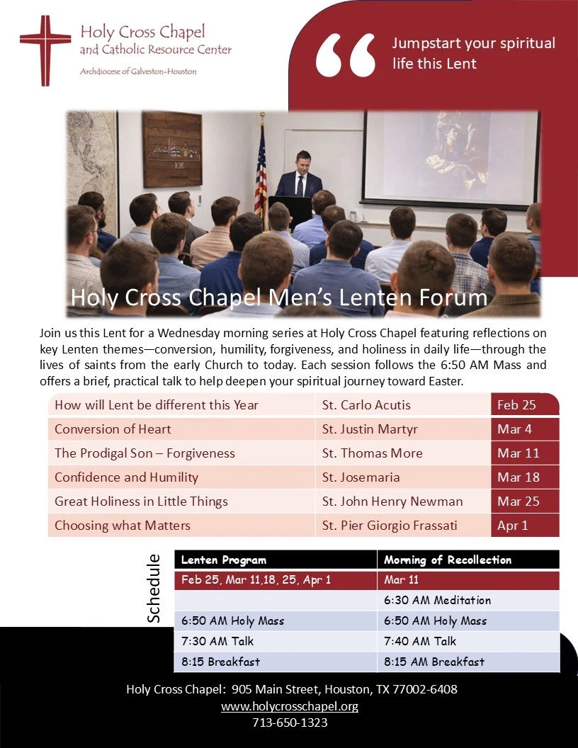 The Holy Cross Chapel offers various activities to support and encourage men to be professional and faithful leaders in the workplace and at home. The monthly Morning of Recollection, Evening of Recollection, and annual Lenten forum are three such activities for men. For more information, please contact the Chapel or subscribe below to receive email notifications of men's activities.